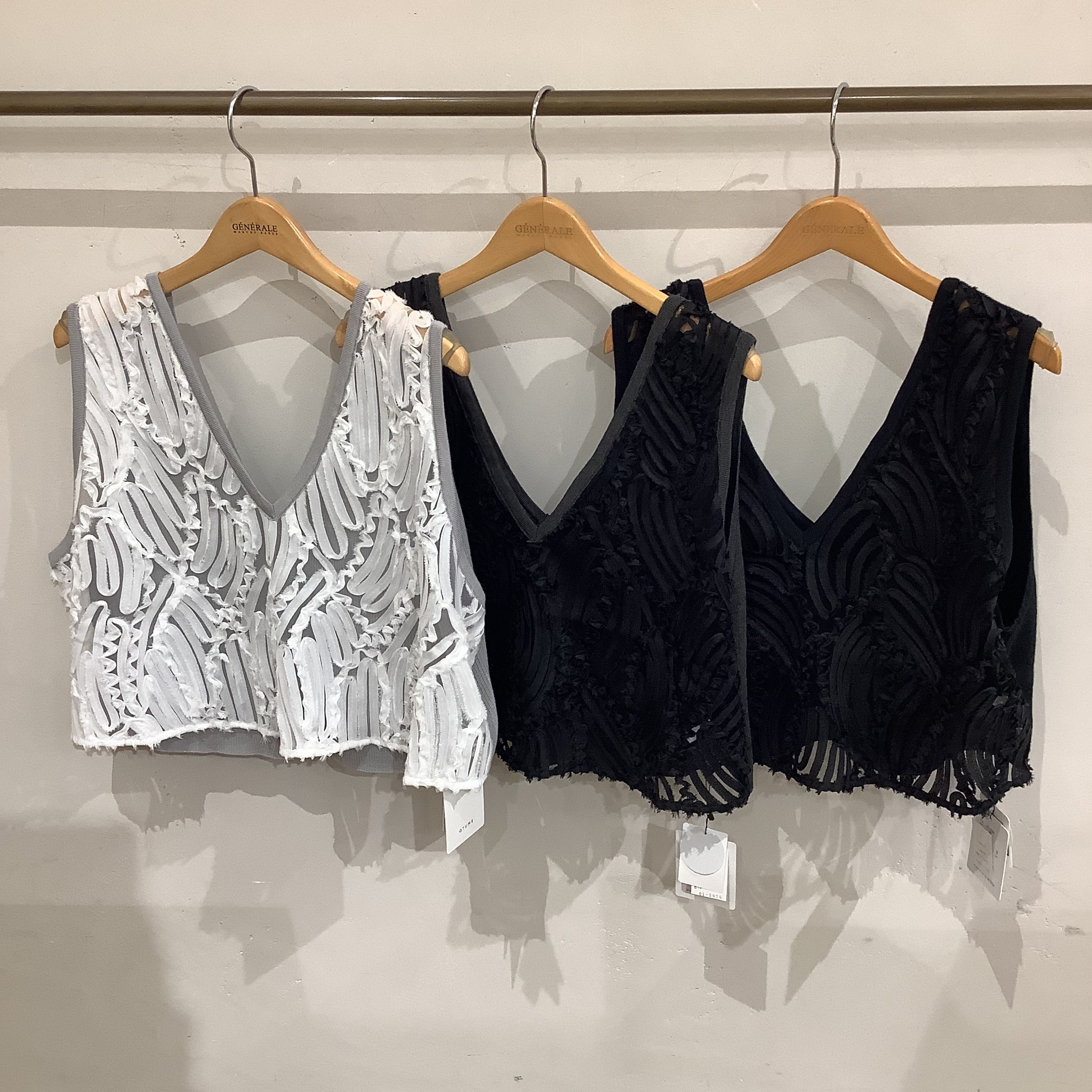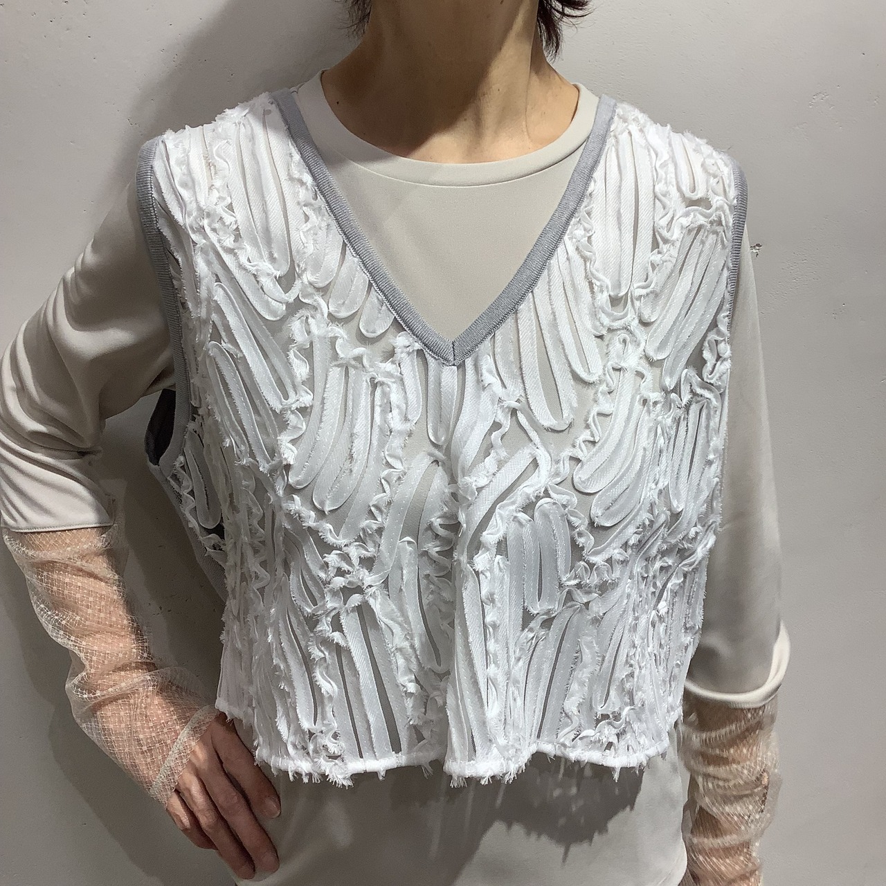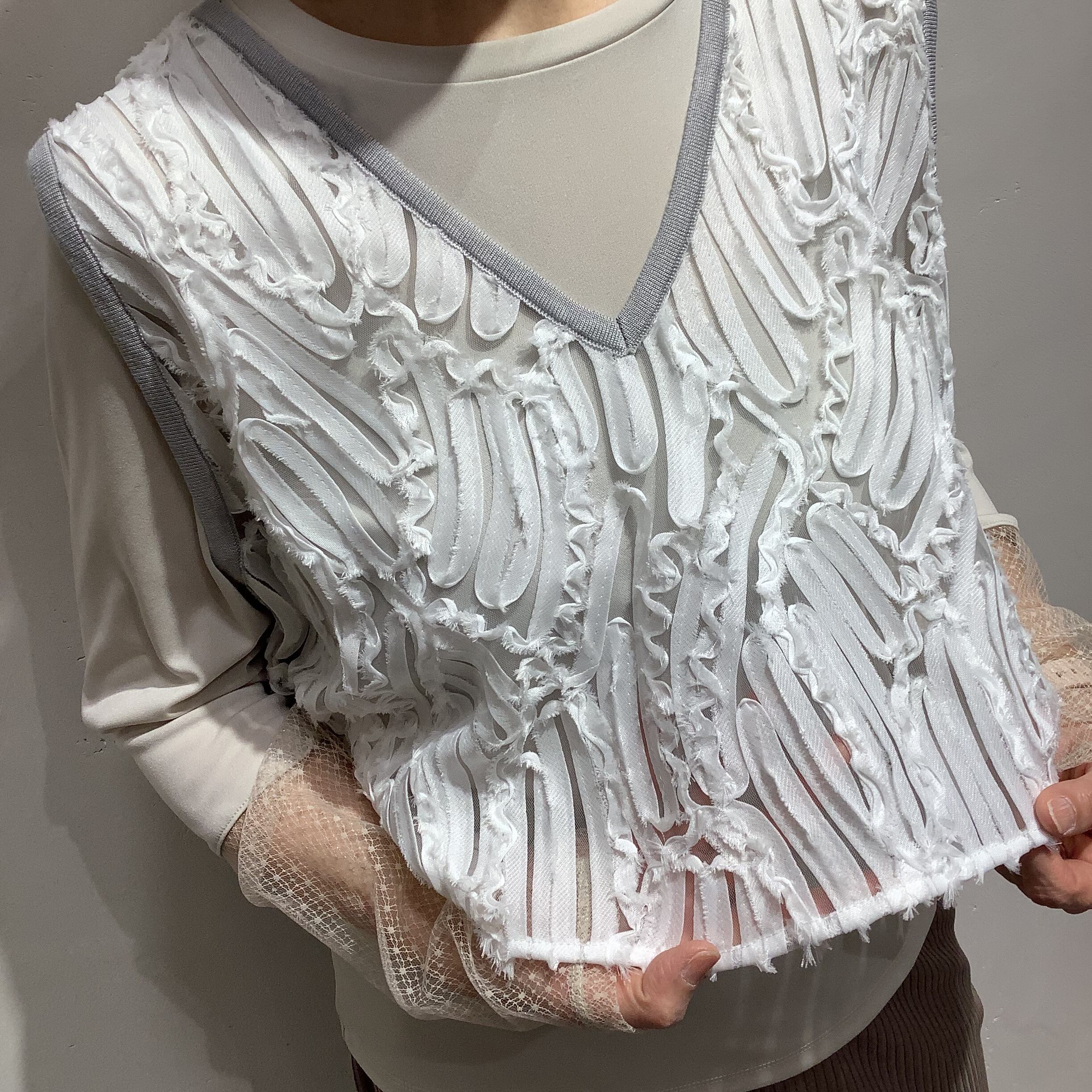 オーガンジーにテープで刺繡をあしらった、