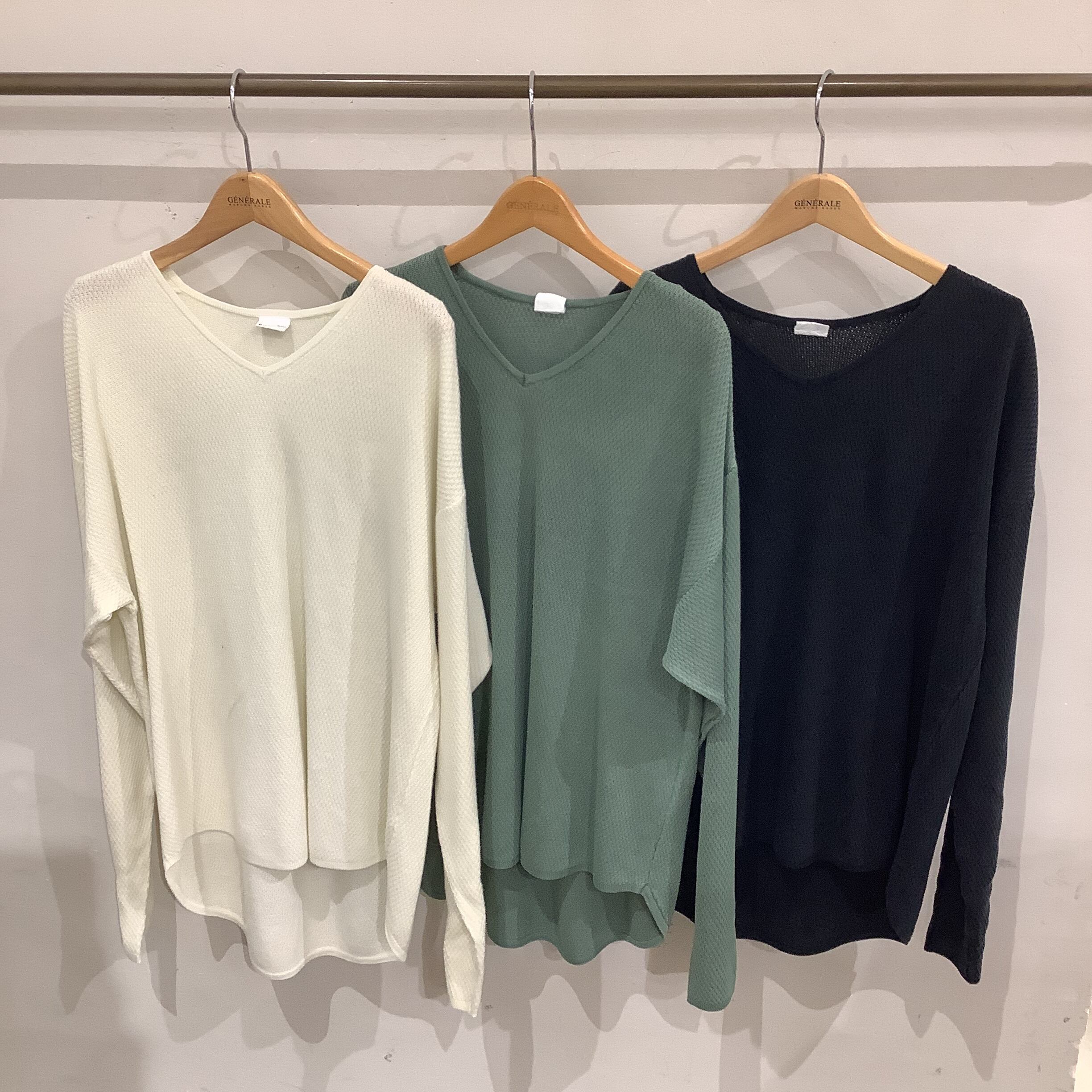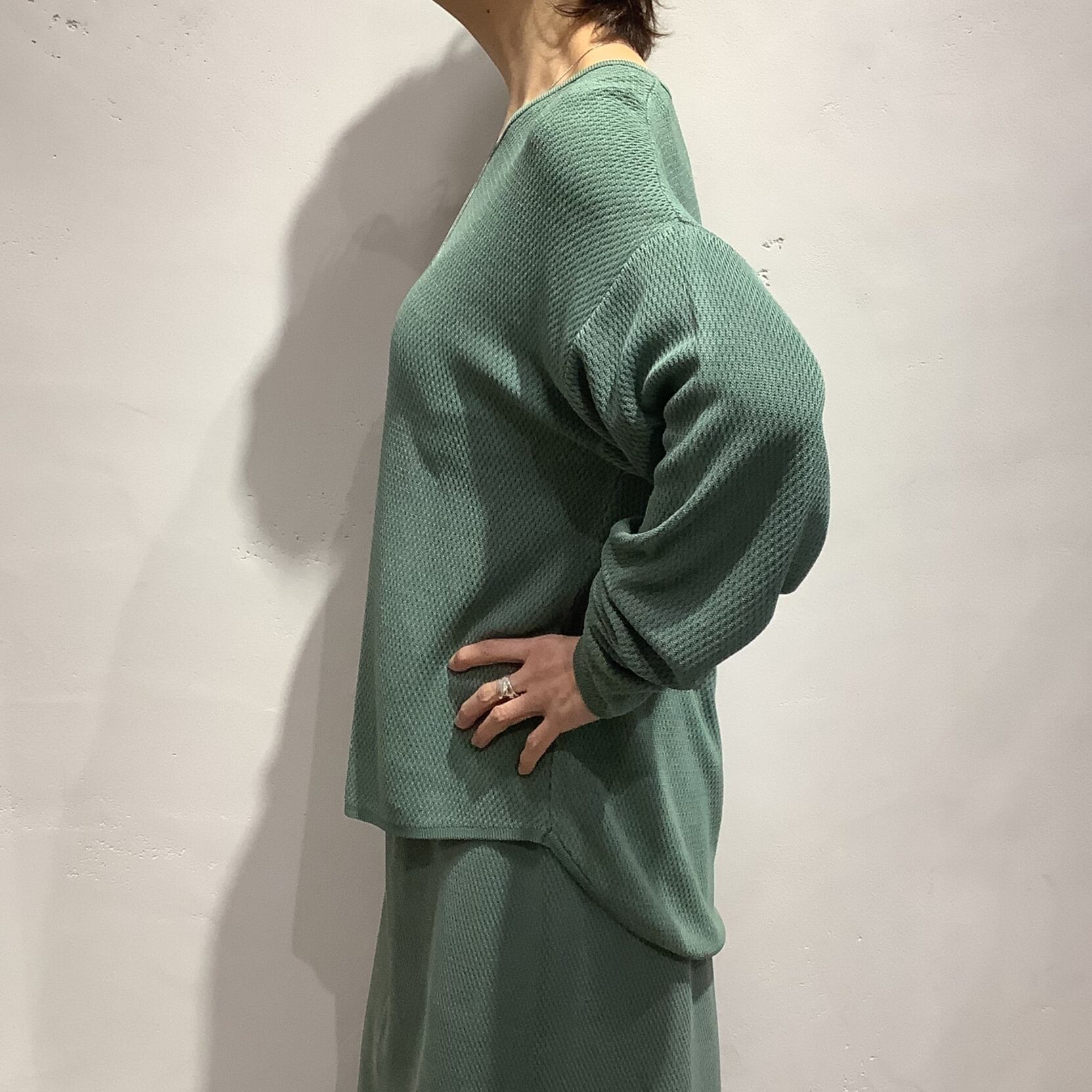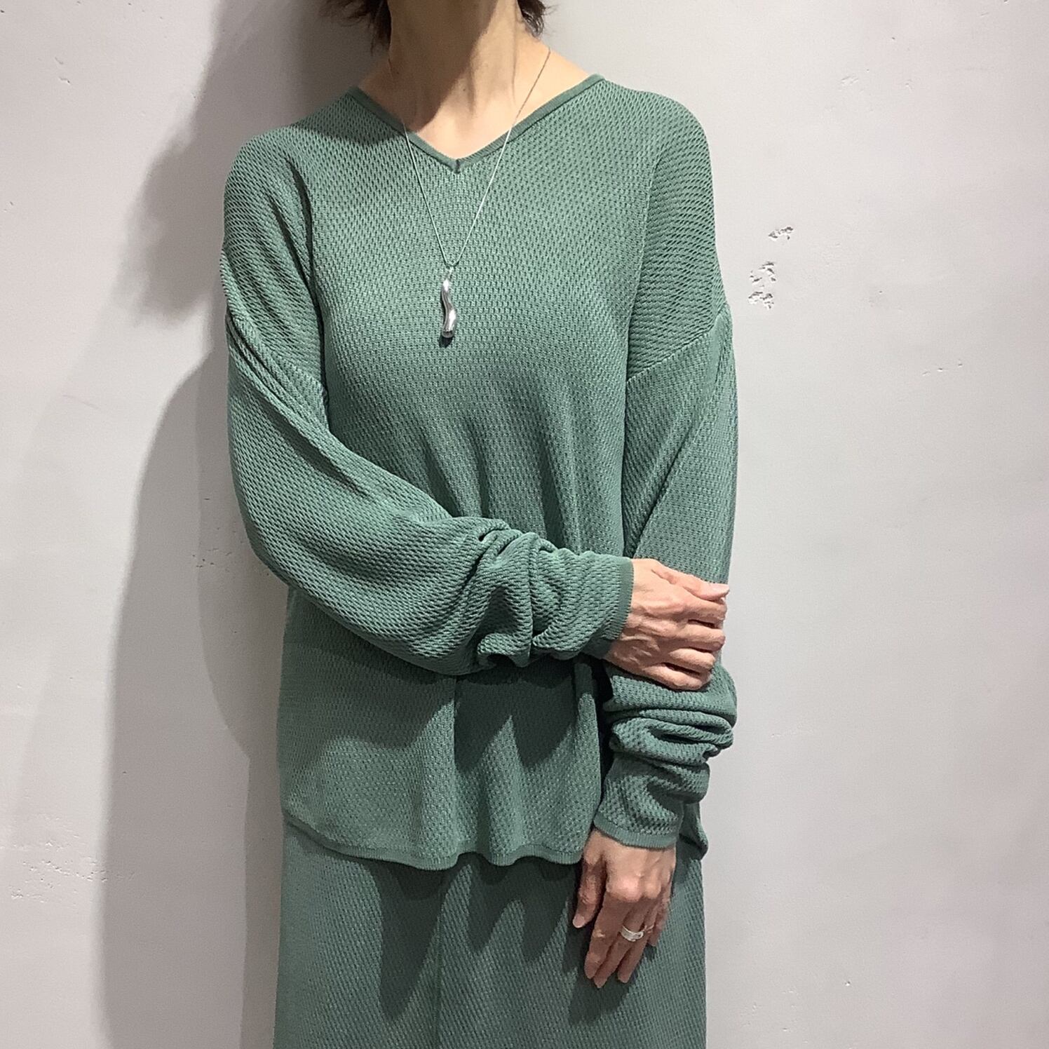 ハニカムワッフルVネックニット。